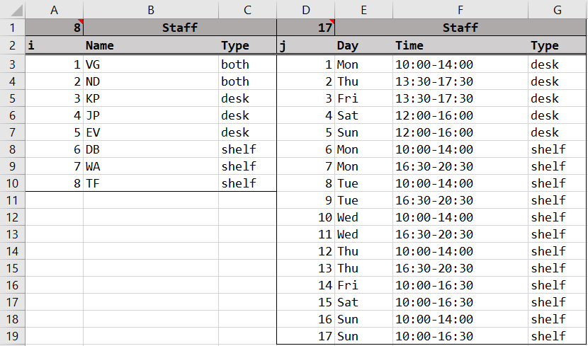 In Julia, we will classify the employees into arrays according to their type (desk/shelf/both). Similarly, we classify the shifts into arrays according to their type and also day of the week. These arrays will make construction of the model constraints easier later on.